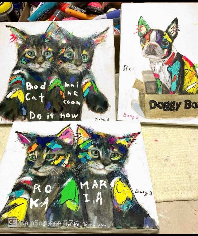 【使用材料】アクリル絵の具、アクリルスプレー、水彩色鉛筆、クレパス、ペンキ、フィキサチフ、モデリングペースト、樹脂絵の具、マーカー
